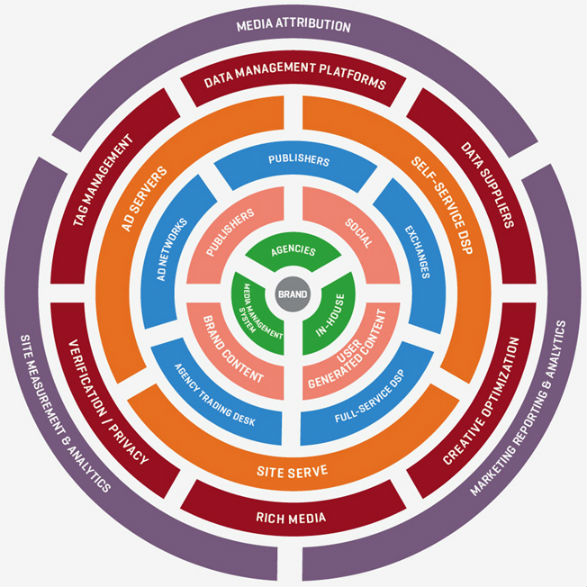 The IAB has recently unveiled a chart which looks at the same arrangement from a different point of view. Instead of focusing on specific companies and platforms (in fact, it does not list them at all), the Digital Advertising Arena instead concentrates on the relationship between the layers of suppliers and consumers of data, services, and platforms, much like the layers of an onion. At the center is the brand, with each type of value contribution represented as a colored layer.