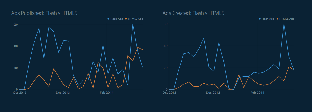 In the end, we validated that we could get all the info into one place, and created, for instance, dashboards with these graphs comparing types of Flite ads published or created (HTML5 vs. Flash) for two different customers.