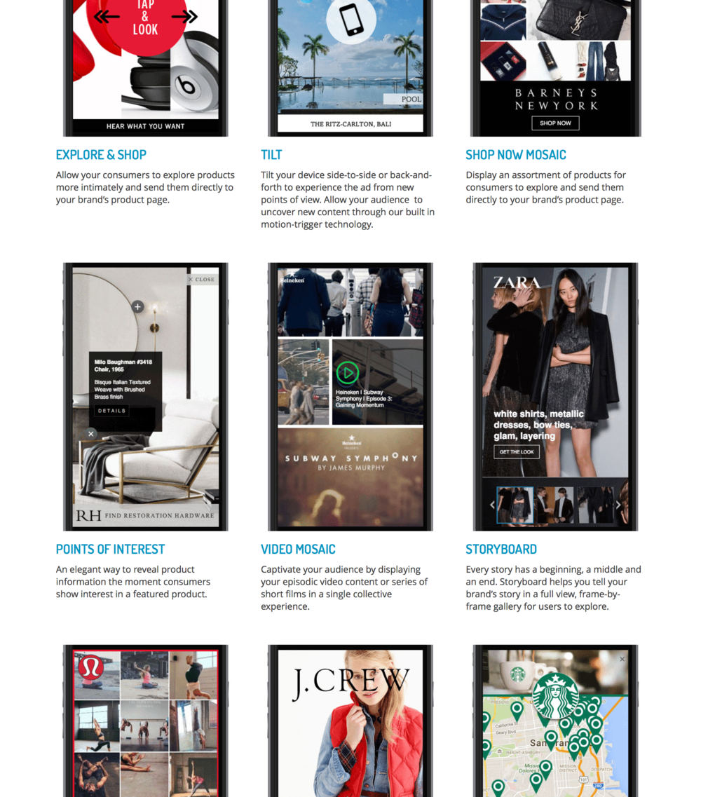 Encourage consumers to engage directly with your brand from within an ad. Use a phone’s accelerometer so consumers can tilt their device to pan through an image. Or use Flite’s unique Storyboard and Video Mosaic products to tell your unique brand story through images and movies. With Flite’s Discovery & Immersion Ad Products, no matter what your goals are consumers will be engaged and learn about your brand.