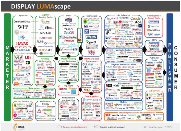 /The Display LUMAscape & IAB Digital Advertising ArenaFor years, LUMA Partners' CEO Terence Kawaja provided the only reliable map to navigate the intricate value chain of the display digital advertising business. The Display LUMAscape provides an easy-to-read, if a little cluttered, expose of the ad technology ecosystem, with the buy side on the left and the sell side on the right. Prominent players in the ad tech marketplace are clustered together, with notations for companies that have been either acquired or closed.