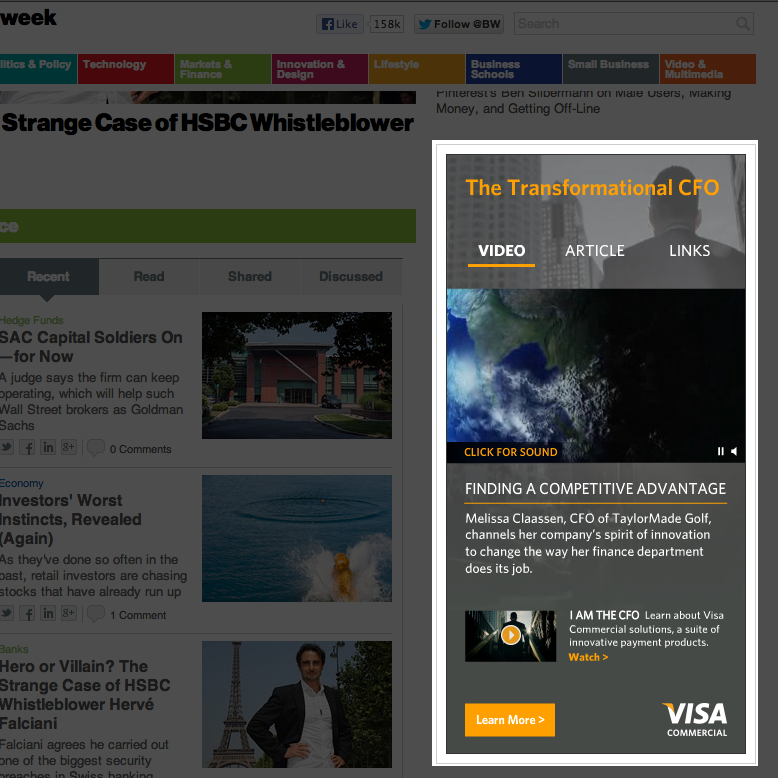 A Visa Commercial content ad showcases videos, articles and links, as seen on Bloomberg Businessweek.