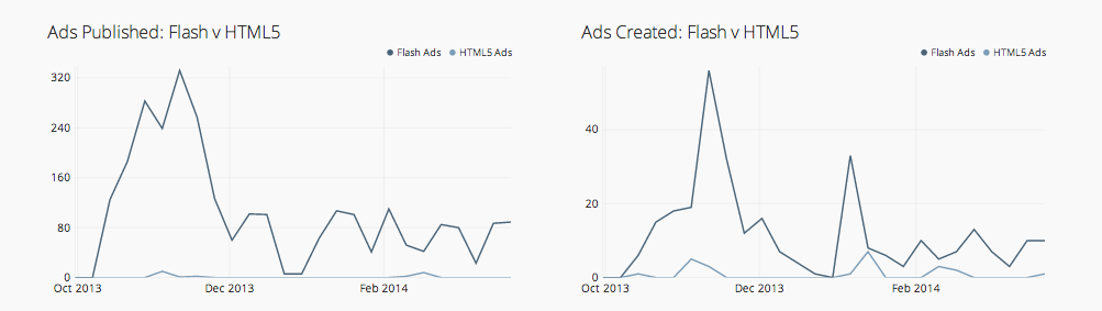 In the end, we validated that we could get all the info into one place, and created, for instance, dashboards with these graphs comparing types of Flite ads published or created (HTML5 vs. Flash) for two different customers.
