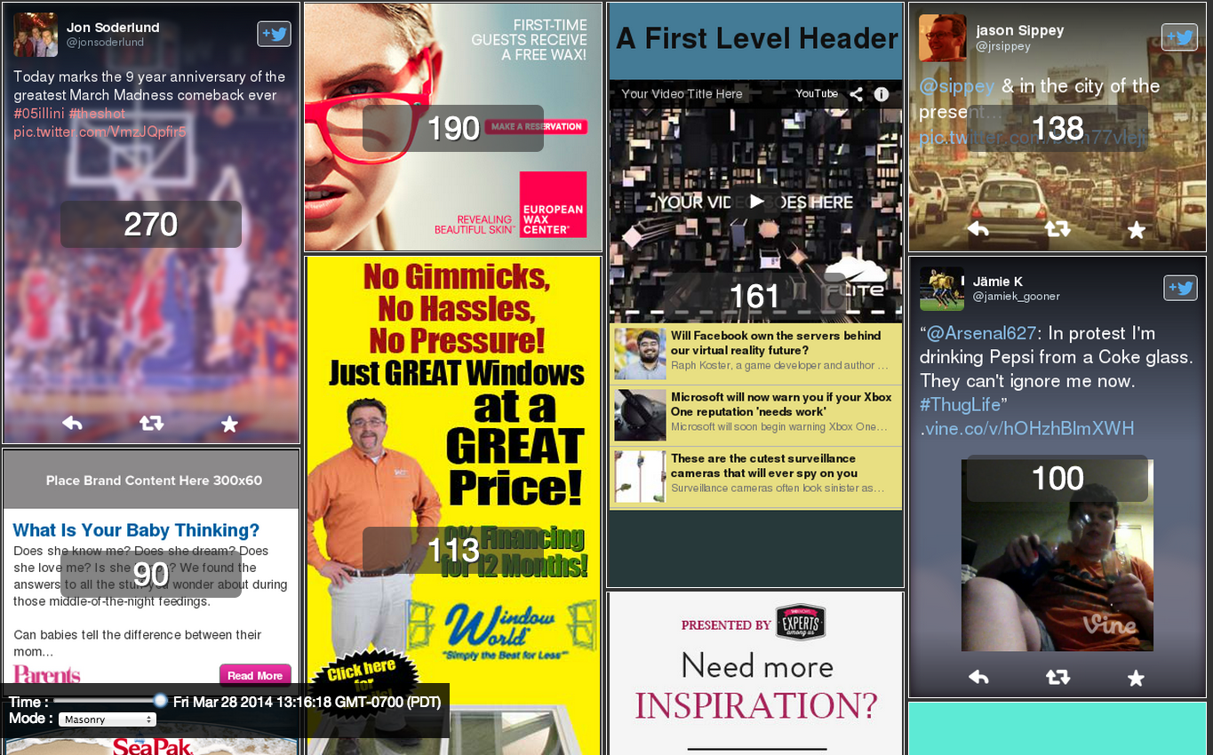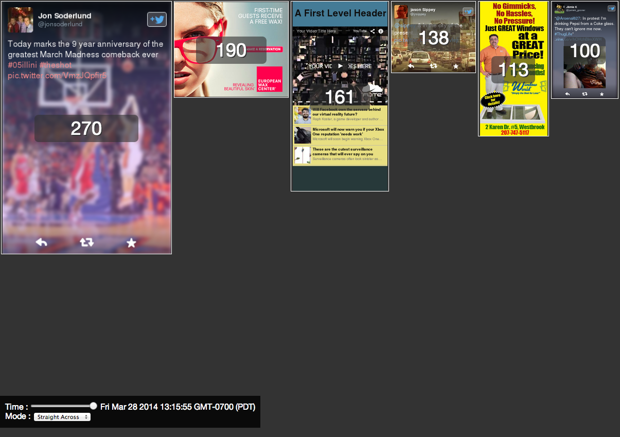 We created a live visualizations of the top ads being served by Flite, ordered by the number of impressions per minute. We ran a test against our QA servers and generated fake traffic for ads imported from our production environment. We used our existing Realtime infrastructure and a JavaScript layout library called Isotope