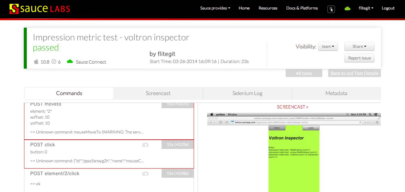 A difficulty when developing these tests is the lack of access to the browser while the test is running, and therefore access to browser-based developer tools that help us understand and debug our javascript. The Voltron Inspector Component provides transparency into javascript tests run in SauceLabs virtual browsers by displaying logs directly in SauceLabs’ test results. If the Voltron Mixin is included in the tag, details from metrics events will be logged. Even without the mixin however, the developer of the test has the option of putting in log statements to display contextual information that will help develop and debug the test.